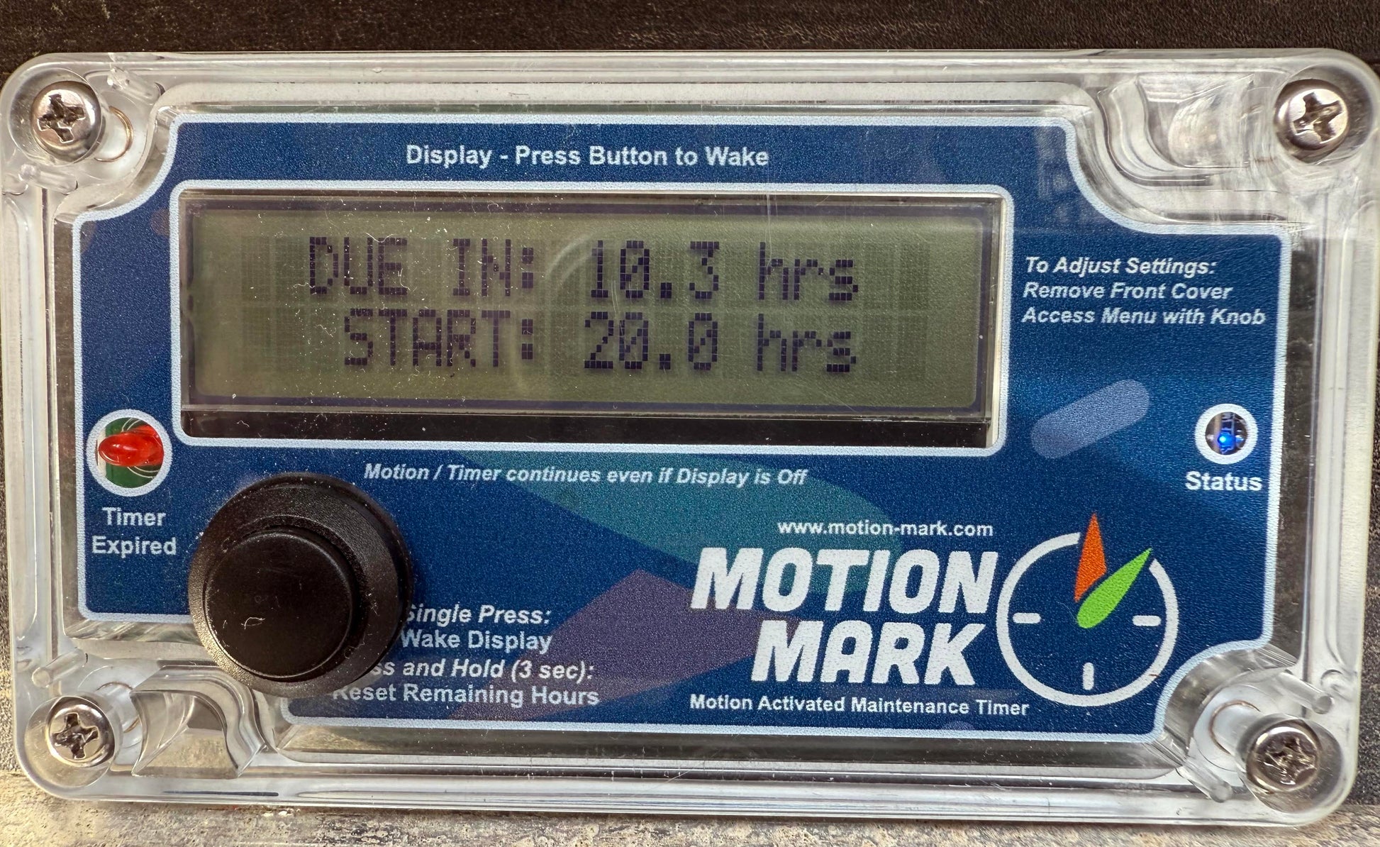 The MotionMark MMT-Advanced is a configurable maintenance timer that records time only when your equipment is is motion. One the timer expires, it is reset by simply pressing the button after you have performed lubrication or maintenance.